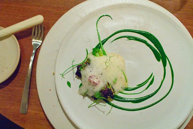 Парад основных блюд открывает кальмар с незрелыми ягодами тёрна. Блюдо подаётся с белой смородиной и муссом из свежей хвои.