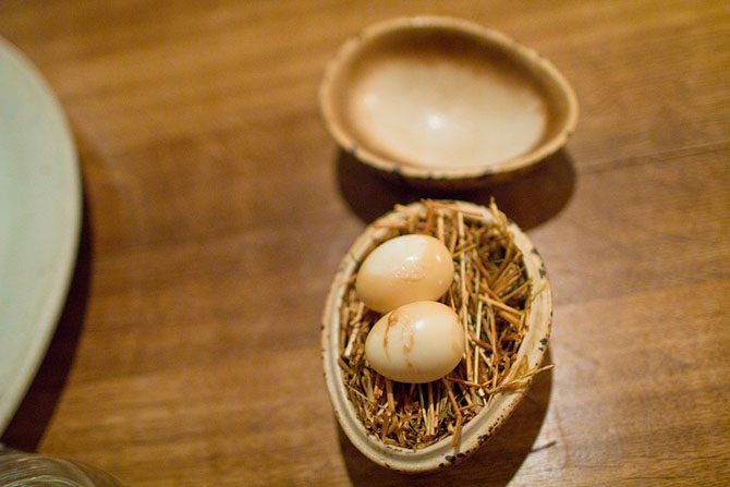 «Курица и яйцо» – одно из фирменных блюд ресторана, состоящее из перепелиных копчёно-маринованных яиц, которые подаются в яйцеобразной коробочке.