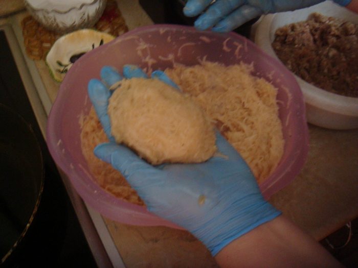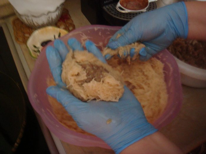 Краями «лепёшки» закрыть фарш. Взяла немного тертой картошки, чтобы сформовать вот такой «колдун»