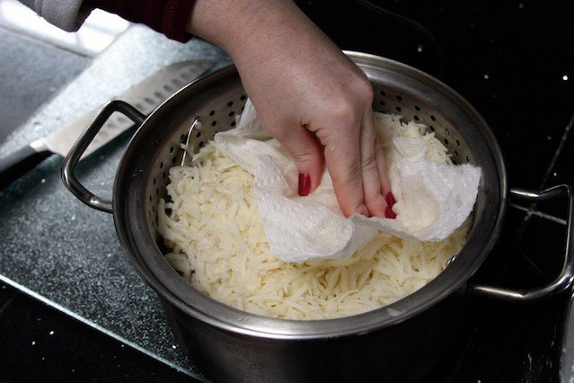 Сначала картофель немного отжимала руками, но под конец, когда жидкости стало многовато, откинула картошку в дуршлаг. Жидкость стекла и колдуны отлично формовались!
