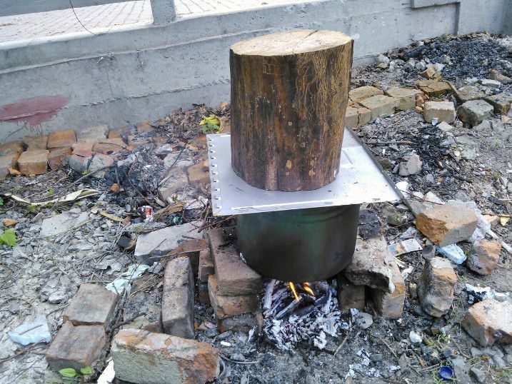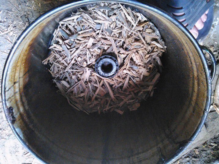 Ставим нашу импровизированную коптильню на такую же спорную))) подставку и засыпаем щепки.