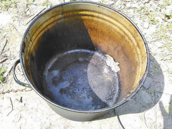 Теперь о самой коптильне. Нашел старую прогоревшую 10-ти литровую кастрюлю в гараже. Дырка — не беда, комок фольги все исправил, главное его плотно упаковать с 2-х сторон. Важно чтоб Ваша ёмкость раньше не использовалась для не пищевых материалов (масло, бензин, кокаин)
