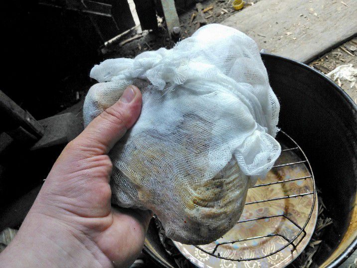 Важно!!!: Обмотайте плотно тканью для копчения! Когда вы её снимете, останется только копчености, а главный и лишний кислый нагар уйдет в мусор вместе с тканью. Если делать без ткани то придется снимать и выкидывать шкурку — да, это не холодное копчение неделями, где шкурка самое вкусное, тут на поверхности будет тот самый страшный, ужасный и главное кислый «канцероген». Я использовал обычную марлю — минимализм оказался стилем этого эксперимента!))