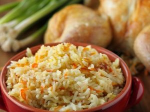 Выкладываем рис на подготовленный противень, формируя горку овальной формы и таких размеров, чтобы курица полностью накрыла ее.