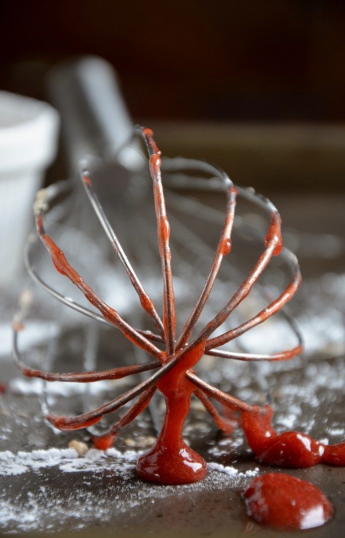 7. Крупным планом: клубничный соус стекает на стол с металлического венчика. (Фото: Aniko Meneghinine)