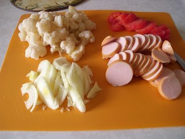 На тесто выкладываем цветную капусту, лук, сосиски, помидоры, заливаем майонезом и обильно посыпаем сыром. Если есть время, можете начинку обжарить – сначала лук, затем добавляем цветную капусту, через пару минут сосиски. Обжаренную начинку выкладываем на тесто, сверху помидоры, заливаем майонезом и посыпаем сыром. Сыра не жалейте, чем больше сыра, тем пицца вкуснее.