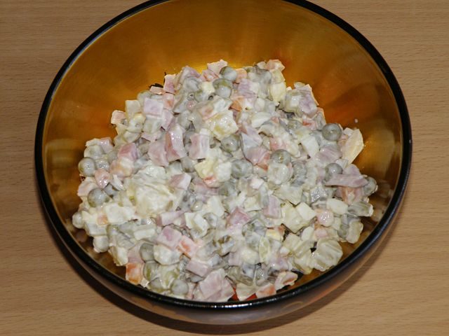 Ну а последний «сосисочный» салат – это всеми любимый Оливье, только, конечно, с сосисками.