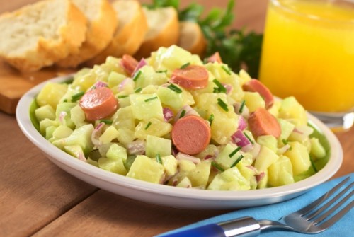 Обычно для салатов сосиски, если они подвергаются температурной обработке, остужаются, но в следующем рецепте предлагается использовать их в горячем виде. Таким образом, следующий вариант салата с сосисками – теплый.
