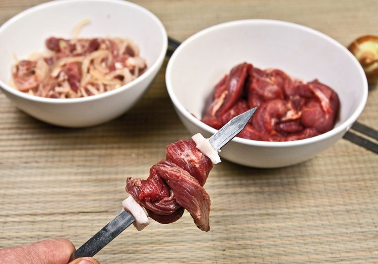 Плетение завершается нанизыванием свободных концов кусочков мяса на кончике шампура, чтобы зафиксировать конструкцию. И — ещё одним кусочком сала, который сыграет роль прослойки между этой и следующей косичкой. В целом — ничего сложного, если с самого начала задать нужный для «плетения» алгоритм, всякий раз сдвигая готовую косичку ниже по шампуру, чтобы освободить место для новой.
