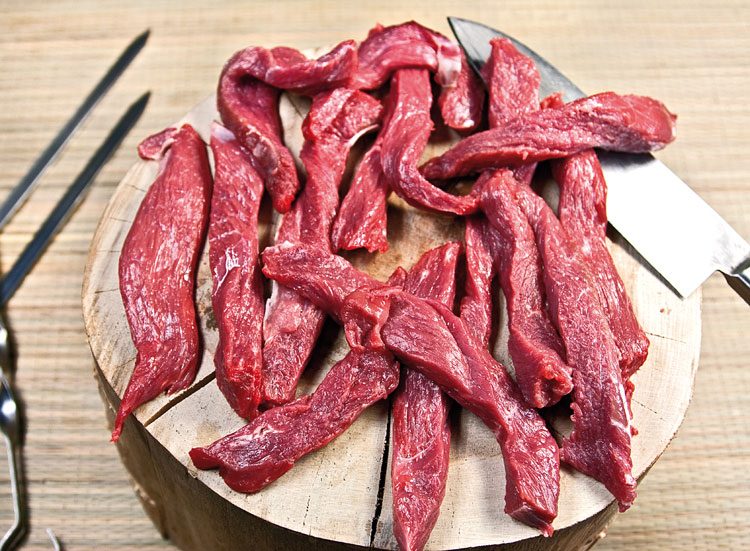 Каждый «стейк» порезал (опять же вдоль волокон) на «ленты» примерно в палец толщиной, попутно, что очень удобно, избавляясь от межмышечных пленок и лишнего сала. Задумка, думаю, понятна: довольно длинные брусочки баранины очень удобны, чтобы заплести их на шампуре в виде косички. Для чего? Давайте посмотрим.