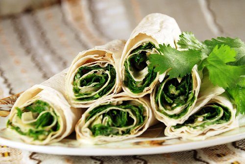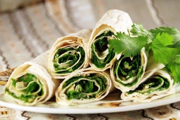 Свернуть лаваш в рол (рулет) начиная с того конца, где начинка. Сворачивать надо достаточно плотно,