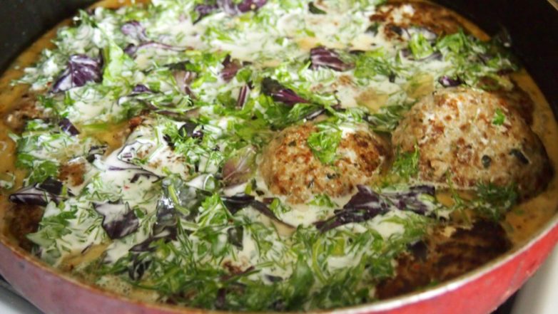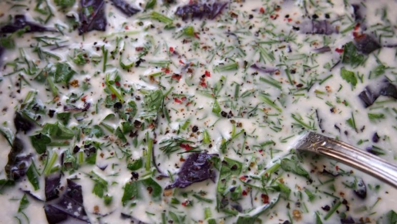 Сливки разводим с водой, добавляем в них специи и нарезанную зелень