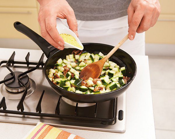 Нарезаем цукини, лук, бекон