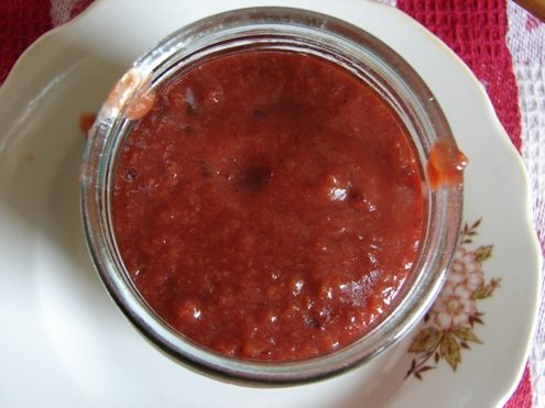 Этот соус имеет кисло-сладкий вкус. А, если вы любитель острых ощущений, то можно добавить в состав горький перец. Он хорошо подходит к мясным блюдам, овощам приготовленным на гриле и имеет красивый бордовый цвет. Попробуйте, надеюсь, он прийдётся вам по вкусу.