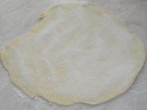 Теперь переходим к формированию розочек. Для этого тесто нужно раскатать в пласт толщиной 0,5 – 1 см. Посыпать сахаром, количество которого выбрать можно самостоятельно, по вкусу.