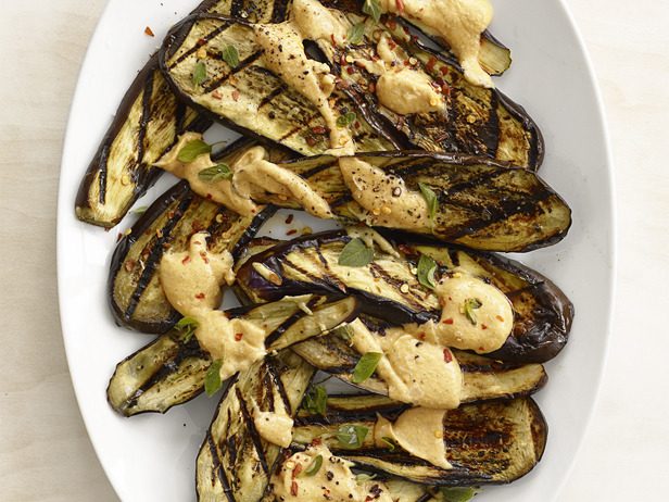 В блендере смешать арахисовую пасту, чеснок, лимонный сок, орегано. Баклажаны тонко нарезать, поперчить, посолить, смазать маслом, обхарить по 3 минуты с каждой стороны. Полить ореховым соусом, посыпать измельчённым орегано и красным перцем.