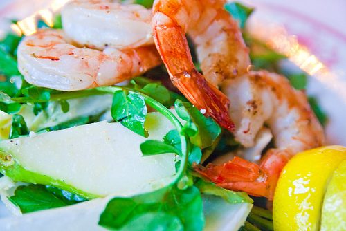 Пока готовится картофель, апельсины смешать с луком, уксусом и оставшимся оливковым маслом. Сняв картофель с гриля, сразу же добавьте его в салат и перемешайте. Картофель на гриле получается суховатым. Если добавить его в салат ещё тёплым, то он пропитается соусом. Добавить в салат рукколу, перемешать.