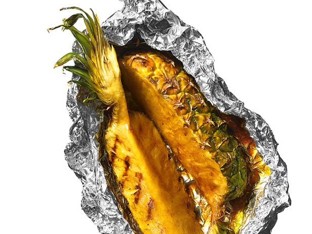 Масло растопить в миске (на водяной бане), смешать с сахаром, приправами, солью и ромом. Ананас разрезать пополам (зелёный хвостик оставить), затем половинки разрезать ещё на три части вдоль. Мякоть ананаса смазать пряным маслом, завернуть в фольгу, сложив по два кусочка. Запекать минут 15-20.