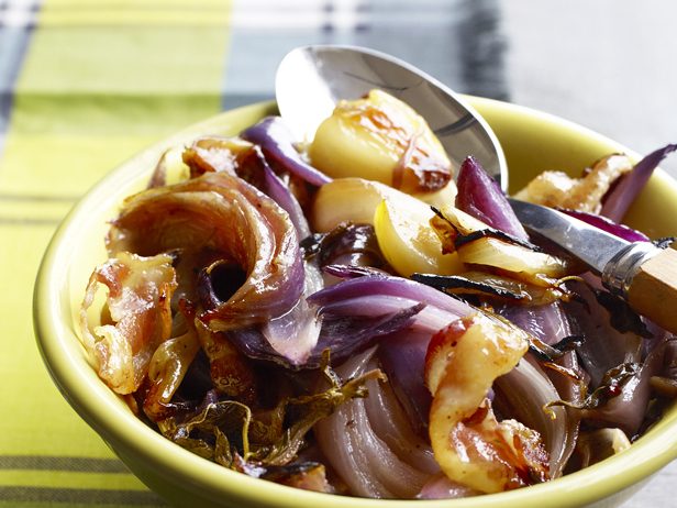 Лук и бекон обжаривать на сковороде на оливковом масле (1 ложка) до тех пор, пока бекон не станет хрустящим. Выложить лук и бекон из сковороды, вылить на неё одну ложку оливкового масла и бальзамический уксус, греть на медленном огне 2-3 минуты.