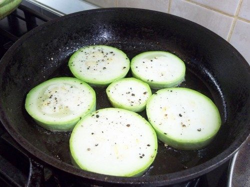 В сковороду налейте растительного масла, нагрейте и положите жариться кабачки.