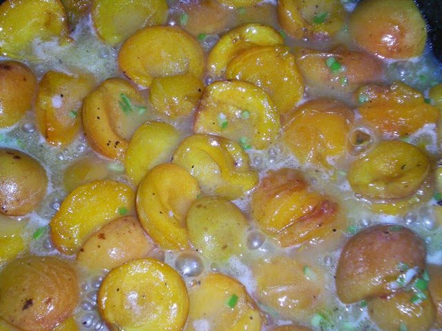 В сковороде растопите сливочное масло и добавьте маринованные абрикосы. Жарьте на среднем огне 5 минут.