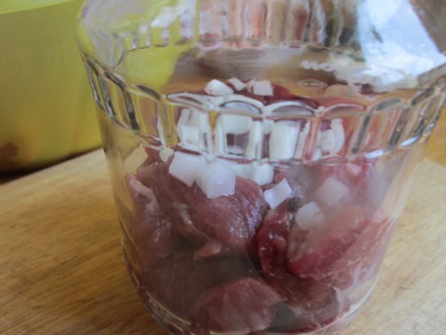 Соединяем мясо с солью, солим то бишь, и оставляем на 5-10 мин не забыв перемешать. Лук, перец, лаврушку и жир я прям в банки буду класть, так удобнее.
