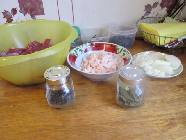Для начало идем в проверенный магазинчик и покупаем свежую говядину и жира говяжьего. Лук и специи дома есть всегда. Вот набор для тушенки. Обратите внимание что это на 4 банки, по многу не делаю ибо не надо, на пару – тройку месяцев хватает а потом еще делаю. Хранить не где, да и смысла нет, у нас не большое потребление тушенки.