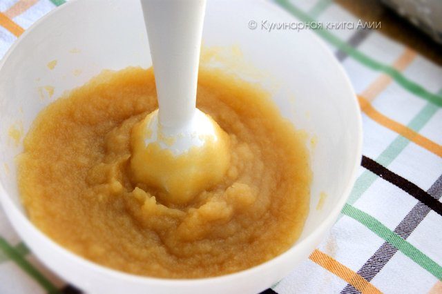 Затем пюрировать блендером (я переложила яблоки в миску, чтобы не испортить кастрюлю)