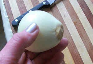 Чистим нашу луковичку, корневое уплотнение срезать не надо, просто обрежем корешки.