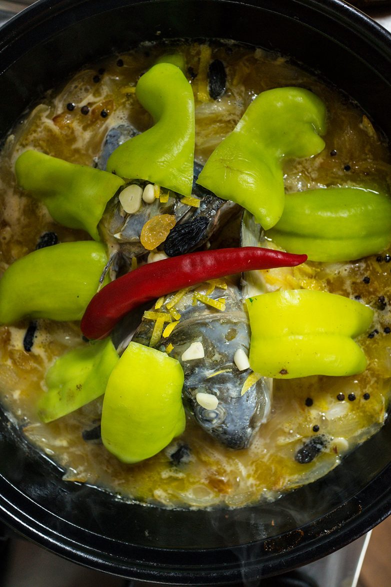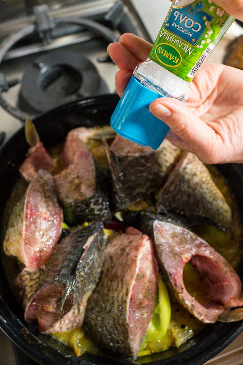 Вот отрегулировать нагрев таким образом, чтобы кипело едва-едва, а под крышкой образовался не острый пар, а туман — это и самое сложное и самое важное. Лучше всего с этой задачей справляется керамическая сковорода, которую поставили на золу, внутри которой едва тлеют угольки, размером с горох, а от уголька до уголька — несколько сантиметров. Этого жара достаточно, поверьте не мне, а народному опыту. И при таком нагреве рыбу можно готовить… несколько часов. Не беспокойтесь, кислота соуса не даст развариться рыбе, но зато соус, который образуется в сковороде, превратится в восхитительное блюдо!