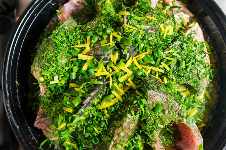 Присыпьте рыбу зеленью и оставшейся цедрой.