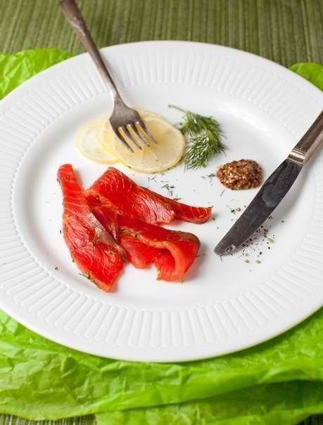 Вам потребуется: Лосось (филе) — 300 г Укроп — 1 пучокЧёрный перец горошком — 1 чайная ложкаЛимон (цедра, сок) — 1 штСахар — 2 чайных ложкиСоль — 4 чайных ложкиКоньяк или водка — 3 столовых ложки Как готовить: 1. Смесью ингредиентов натрите рыбу. 2. Оберните в пищевую пленку и оставьте мариноваться в холодильнике не меньше, чем на 48 часов. 3. Ножом можно снять слой специй, если вы не любите слишком острую/соленую рыбу.