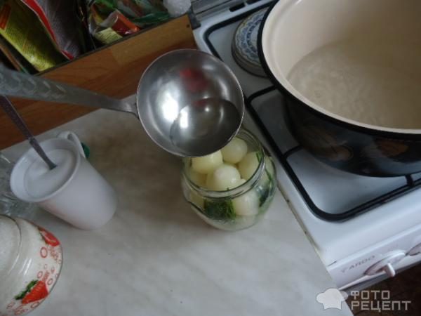 По рецепту содержимое банок следует заливать тем же рассолом, в котором кипятились луковицы, но мне показалось уж слишком большим количество соли, поэтому старый вылила и вскипятила новый маринад. На 1 литр воды – 2 столовые ложки уксуса, ½ ч. л. сахара, 1 ст. л. соли.