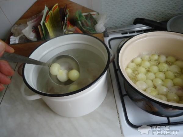 В кипящую воду на 2-3 минуты опускаем подготовленные луковицы. С кипятка – сразу в холодную воду. Емкость с холодной водой следует подготовить заранее.