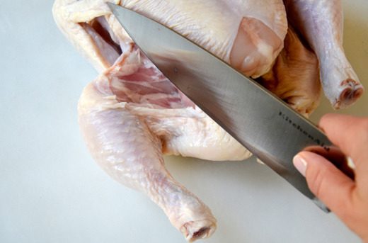 Используя кухонные ножницы, разрежьте непосредственно вдоль толстой линии, пока спинная кость не отделится от остальной части тушки. Повторите этот шаг с другой стороны. Как только вы удалили спинную кость, у вас получатся две куриные грудки.