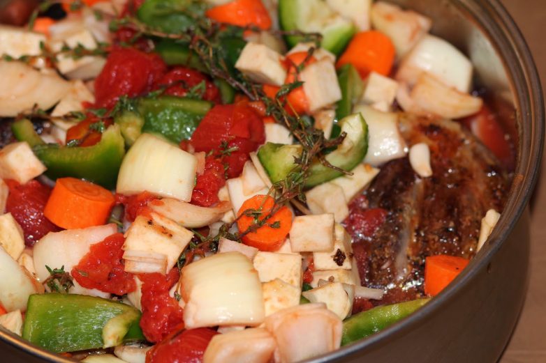 10. Выложить голяшки в кастрюльку, добавить овощи, воду и помидоры. Положить веточки тимьяна и лавровый лист накрыть крышкой и довести все до кипения.