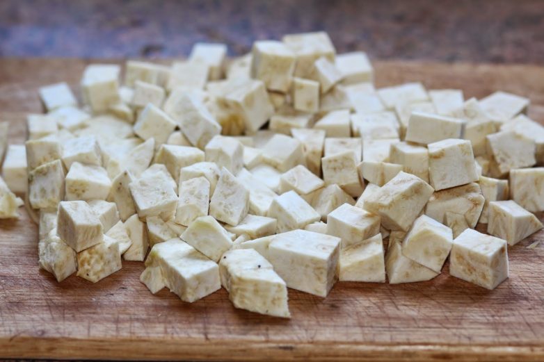 3. Корень сельдерея очистить и нарезать кубиком 1.5 х 1.5 см.