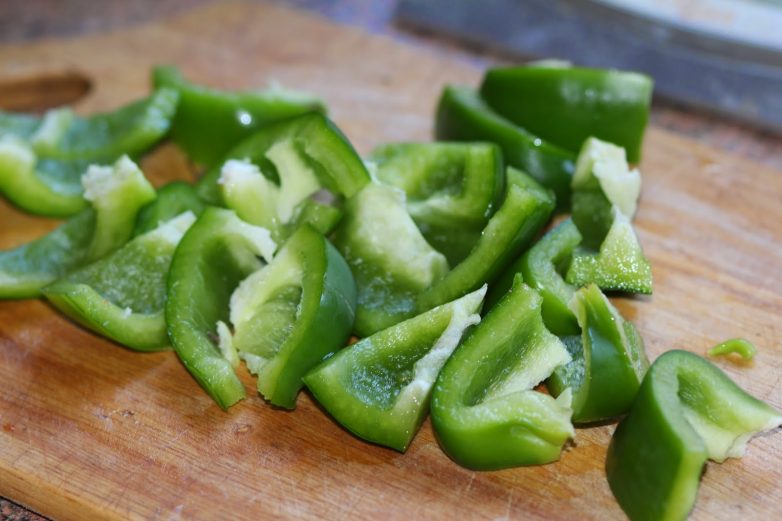 7. Болгарский перец очистить от семян и нарезать крупными квадратиками.