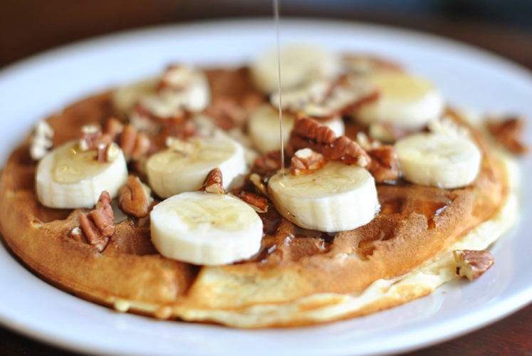Сладкие домашние вафли отличное блюдо к завтраку. К тому же не потребует от вас много усилий. Минимум ингредиентов и минимум времени! Всего десять минут и 8 порций готово. Как раз на всю семью). Если что и останется, то до вечера дождется вас в холодильнике. Насчет сладких дополнений… Я использовала банан, кленовый сироп и измельченные грецкие орехи. Но вам никто не запрещает поэкспериментировать.