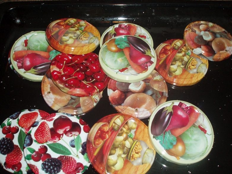 8. Крышки вымыть, прокипятить в течении 5 минут. Переложить крышки на противень и подсушить крышки в течении 2 минут в духовке разогретой до 180 С.