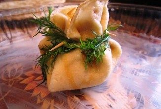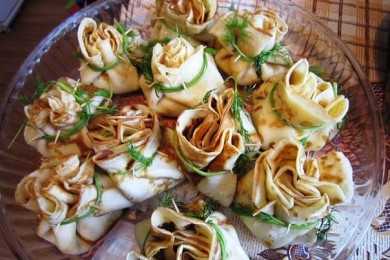 Оригинальный рецепт — Блинные мешочки с жюльеном из красной рыбы. С начинкой — они становятся сытнее и могут служить в качестве закуски на праздничном или фуршетном столе.