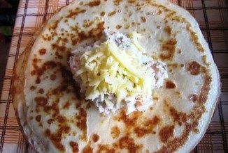 посыпать тертым сыром и поднять края блинчика вверх, формируя мешочек.