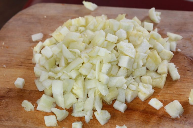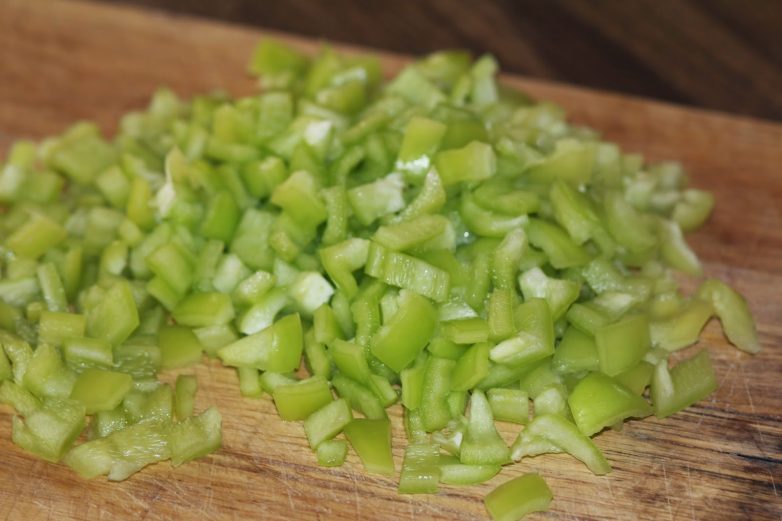 6. Болгарский перец очистить от семечек и нарезать мелким кубиком, примерно 0.5 см.