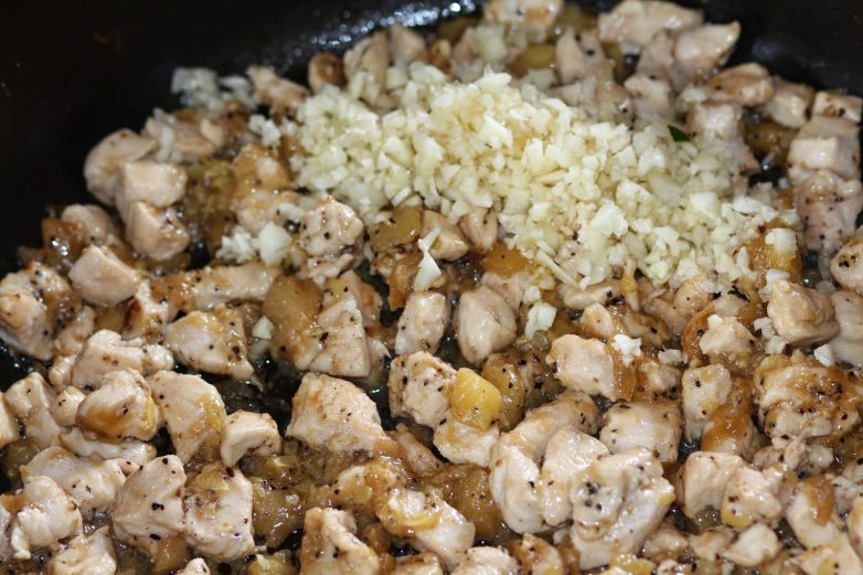 14. Добавить к кабачкам курочку, поперчить и обжаривать все вместе до зололтистого цвета курочки, примерно 5 минут.