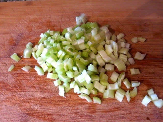 Пока варится картофель, подготавливаем остальные ингредиенты. С внешней стороны черешков сельдерея удаляем грубые волокна. Нарезаем сельдерей очень мелкими кубиками.