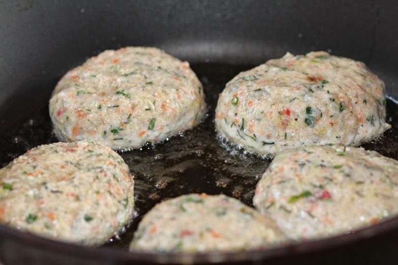 6. Нагреваем сковороду с небольшим количеством масла. Берем столовую ложку (с горкой) фарша. Руки смачиваем водой и формируем котлетки. Выкладываем котлетки на сковородку и жарим на среднем огне 2 — 3 минуты.