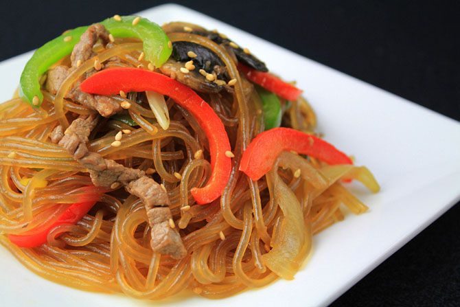 Чапчхэ (кор. 잡채) — традиционная закуска. Блюдо представляет собой салат из лапши (куксу) с овощами и мясом, обжаренной в кунжутном масле с добавлением вкусовых добавок. Чапчхэ издавна входит в состав Корейской придворной кухни. (Chloe Lim)
