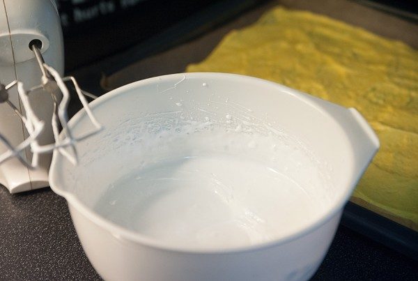 Меренга поднимается и увеличивается в размерах. Даем нашему торту немного остыть, а пока взбиваем крем.