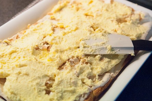Распределяем меренгу поверх бисквитного слоя и обильно посыпаем миндалем. Ставим в духовку на 180 градусов на 15-20 мин.