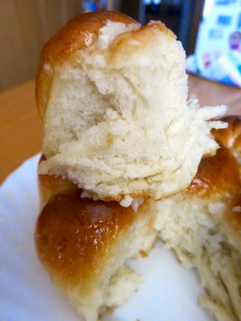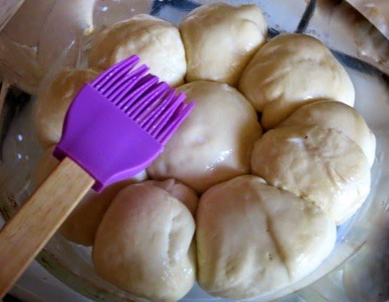 Делаем ножницами крестообразные надрезы на булочках (я забыла.) Слегка смазываем верх пампушек молоком. Ставим в разогретую до 210 С (410 F) духовку и печем 20-25 минут.